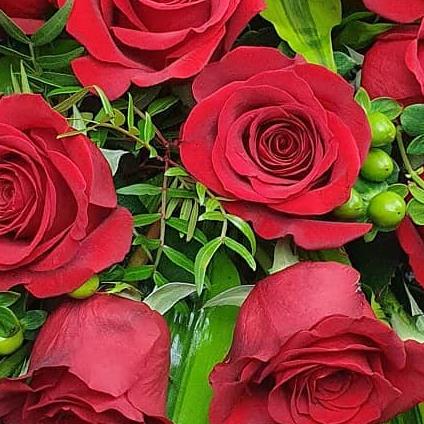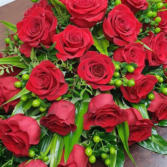 A striking red rose casket spray arranged with premium roses, glossy green foliage, green hypericum berries, and natural textures. A bold and dignified tribute, traditionally symbolic of deep love, honour, and heartfelt remembrance.
