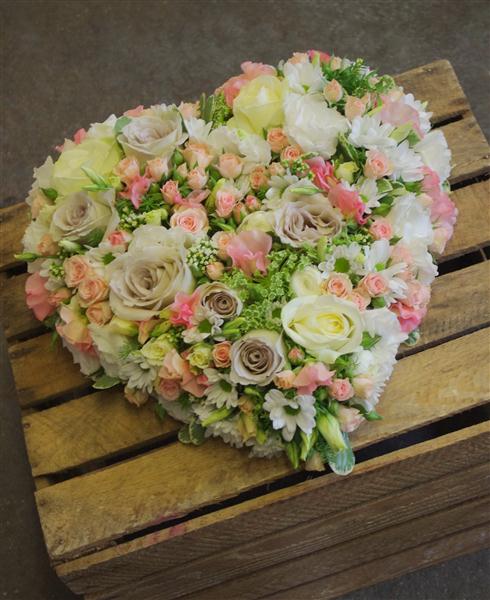 This Delicate arrangement of pretty pastel roses with spray roses and other seasonal blooms is a beautiful tribute for any loved one.