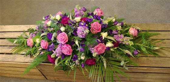 A Beautiful Garden style arrangement casket spray in vibrant pinks and purples.