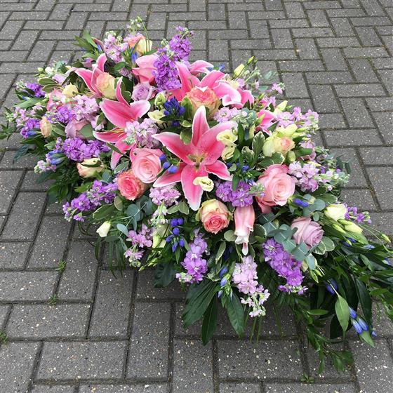 A lush and elegant casket spray with pink oriental lilies, lilac stocks, soft roses, lisianthus and seasonal fillers. This design blends fragrance and colour in a delicate, garden-style tribute filled with softness and graceful expression.