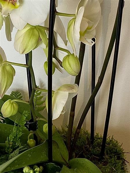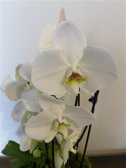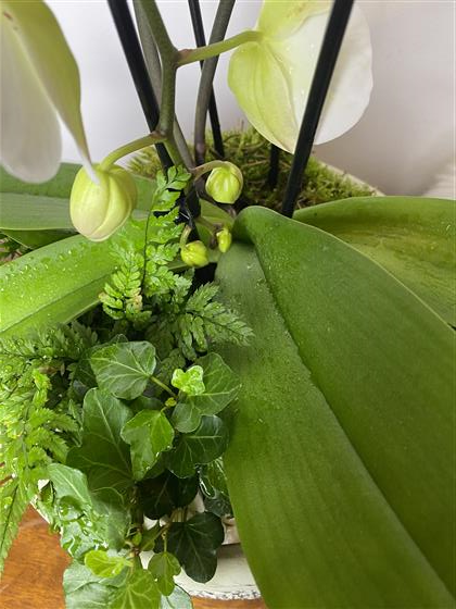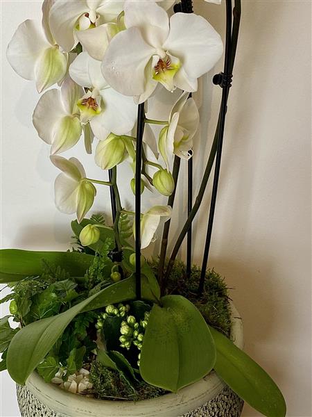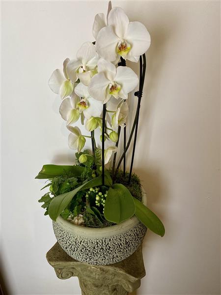 This orchid arrangement is planted in a large stylish heavy concrete pot, making it a beautiful display piece. It features elegant white phalaenopsis orchids, planted in a bed of other smaller plants such as ivy, fern and moss, making it the ideal gift for plant lovers.