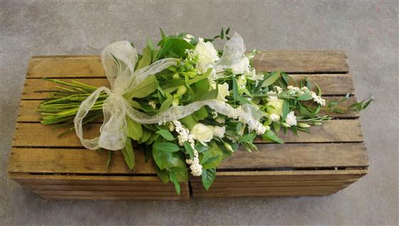 A simply beautiful combination of seasonal white blooms and luscious foliage combine to create a classic traditional sheaf. Includes roses.
