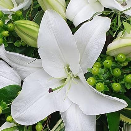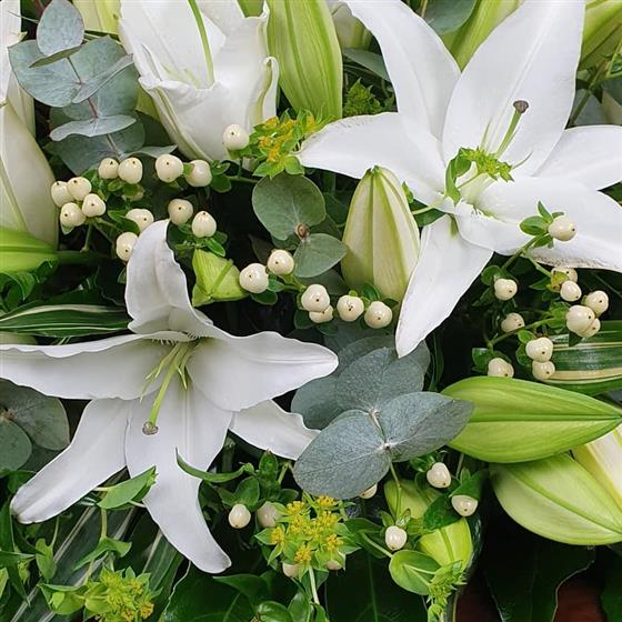 A timeless lily tribute arranged with elegant white oriental lilies, glossy green foliage, eucalyptus, hypericum berries, and touches of lime filler. A serene display, rich in fragrance and purity, perfect for a peaceful final tribute.