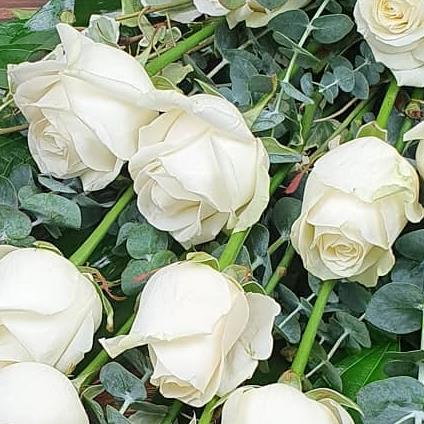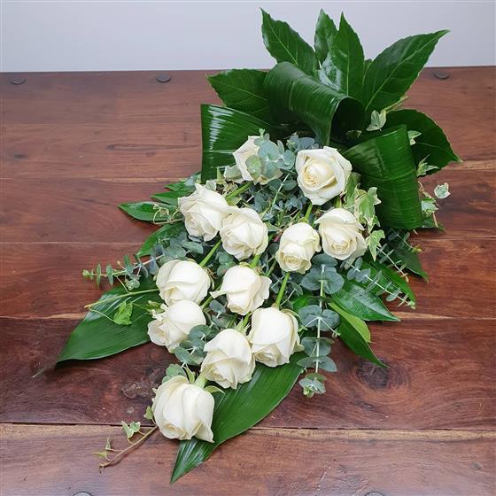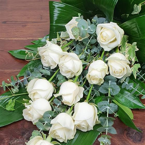 A beautiful hand-tied tribute featuring twelve white roses, curled aspidistra, and flowing eucalyptus. A timeless and dignified farewell, arranged with calm and care.