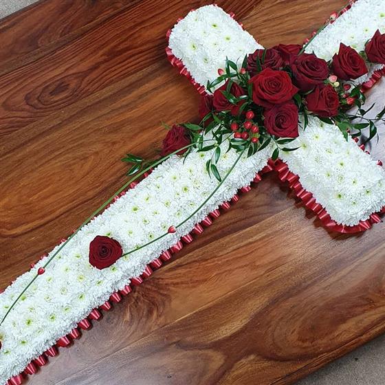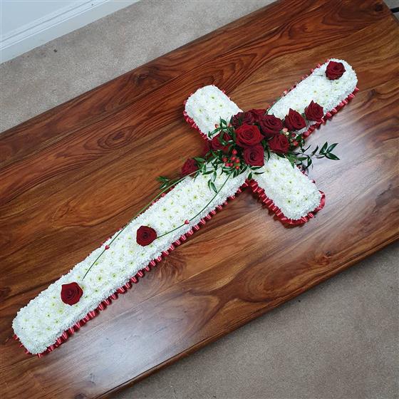 A graceful cross design edged with red ribbon and covered in white chrysanthemums, adorned with elegant red roses. A heartfelt expression of love and remembrance.