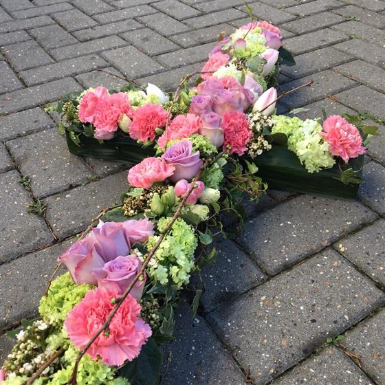 A natural-style floral cross in pastel tones, featuring soft pink carnations, lilac roses, and delicate greenery. A peaceful and graceful tribute with a country garden feel.