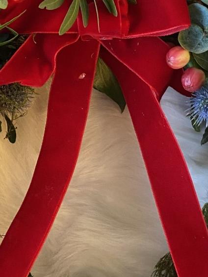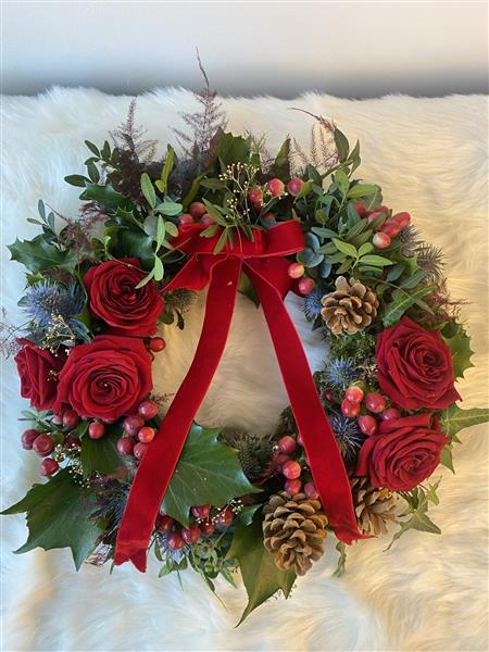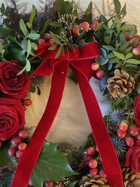 Wreath in velvets reds, roses, pines cones, mistletoe, berry' including thistles and a luxury red bow.